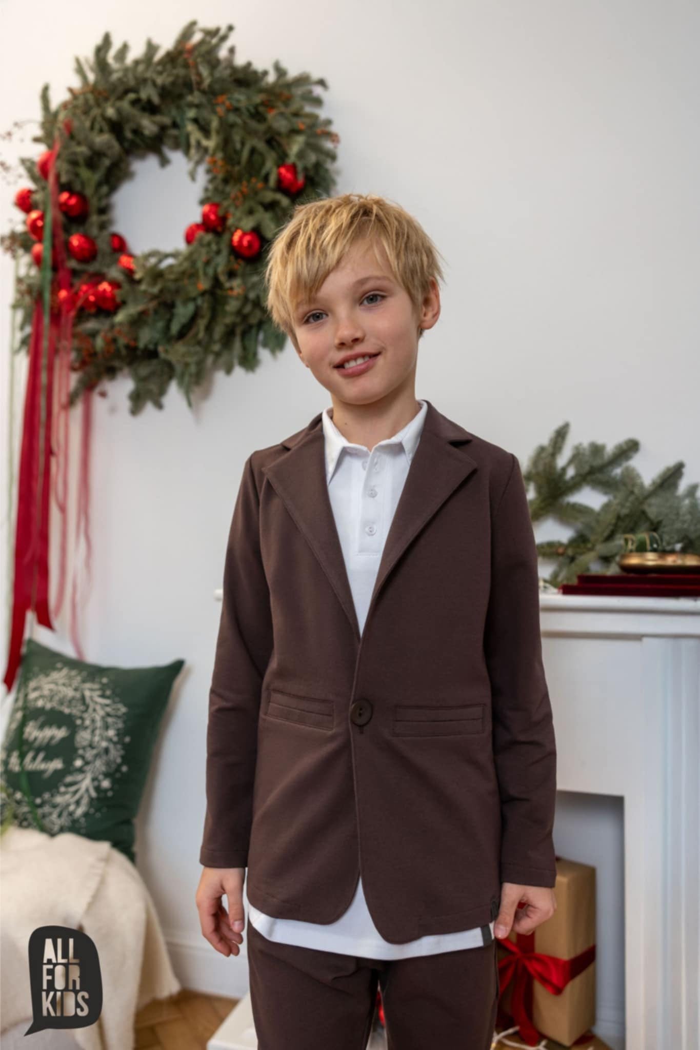 Elegancki Garnitur Chłopięcy All For Kids – Brązowy, Bawełna Premium 95%, Idealny na Święta i Uroczystości